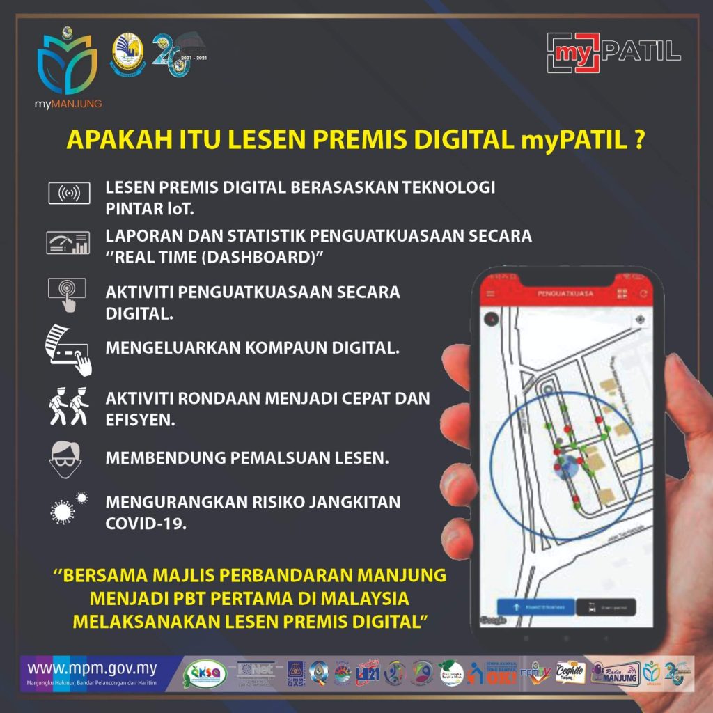 Memudahkan dan lebih selamat. Itulah yang boleh kami di Majlis Perbandaran Manjung simpulkan tentang peranti pintar myPATIL. Lesen Premis Perniagaan yang dahulunya dalam bentuk kertas dan dipamerkan di dinding premis perniagaan kini berada dalam bentuk peranti pintar. Pemilik premis perniagaan boleh menyemak maklumat lesen perniagaan dan status kompaun ...